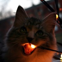 The image shows a cat with its mouth open, possibly making a sound or reacting to something. It appears to be indoors with string lights providing
