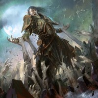 a fantasy scene with an elf standing atop what appears to be a battlefield. The elf is dressed in armor, suggesting they might be a warrior or