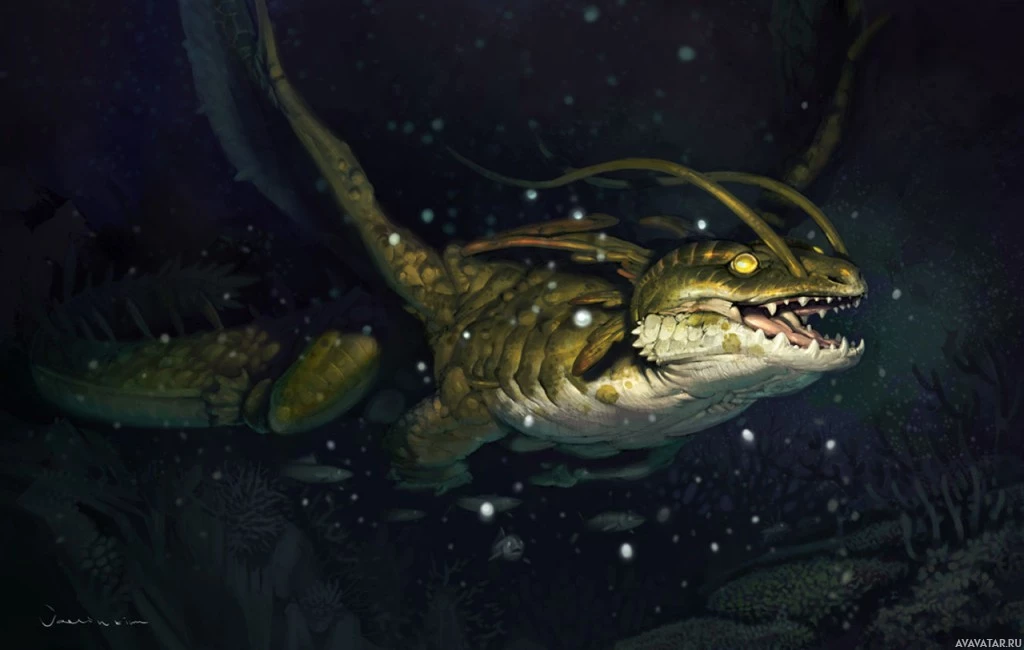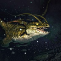 a fantastical creature that appears to be a combination of a dragon and a sea monster, with elements reminiscent of both underwater life and the mythological creatures often found in folklore. It has features such as scales, fins, and tentacles, suggesting it's a creature of the deep sea or an otherworldly creature from