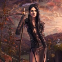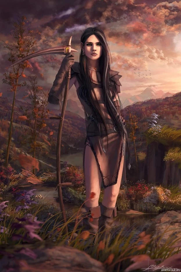 long hair and is wearing armor that includes a skirt or shorts with a high collar, giving her a warrior-like appearance. She is holding what looks like a bow and arrow, suggesting she might be a ranger or archer within this