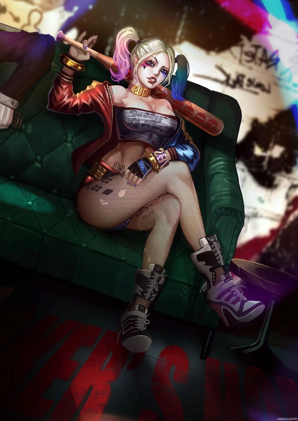 the video game "Overwatch" or similar games, where characters are designed with detailed and colorful costumes. In this depiction, Harley Quinn is shown sitting on a couch with a confident expression, wearing a red jacket over