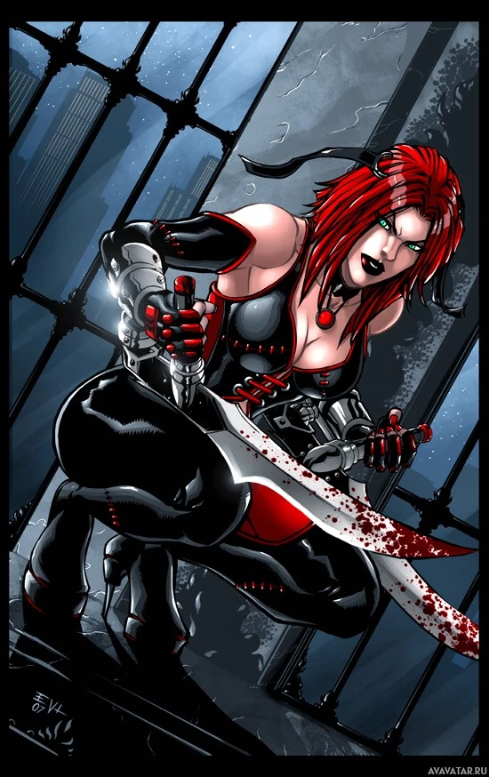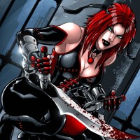 a large knife with blood on it, suggesting that she may be engaged in combat or some form of action-oriented situation. The background appears to be dark and industrial, which could imply a setting such as a dungeon or