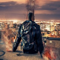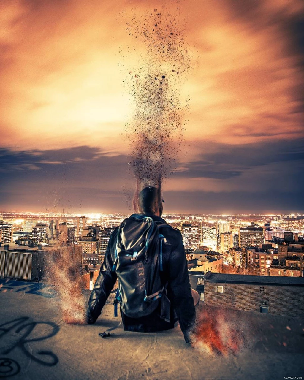 early morning or late evening. There is debris floating around the person, which gives an impression that something significant might have occurred. In the background, there are buildings and lights from the city, indicating