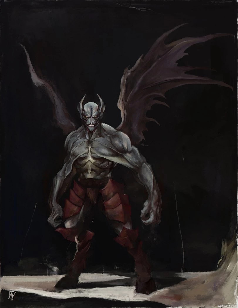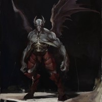 dark wings and bat-like features, giving it an intimidating and demonic appearance. It's holding what looks like a staff or a weapon in its right hand, which is common for characters that use magic or special abilities in games like Dota 2. The color palette is quite muted with