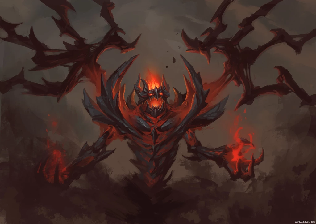shadowy figure, often referred to as a "Shadow Fiend" in fantasy contexts. It has an ominous and intimidating presence, with its arms spread wide and fiery