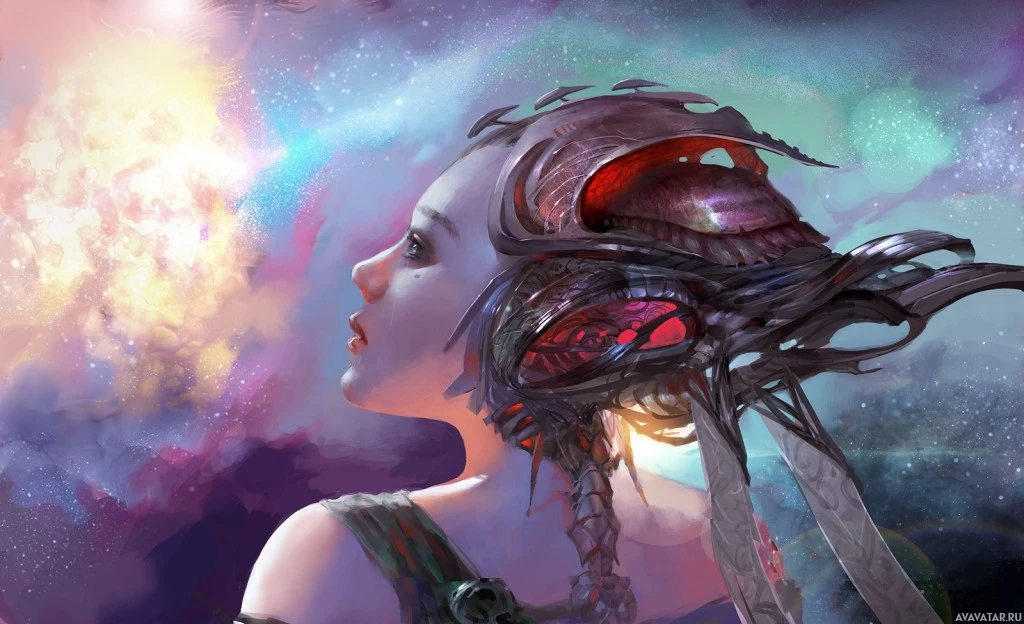 a state of serenity or contemplation. The background is vividly colorful, depicting a cosmic scene with bright stars and nebulae against