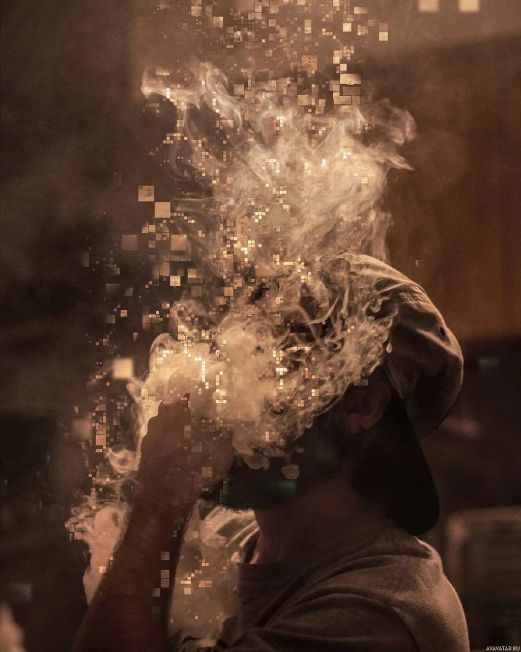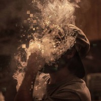 visual effect of the smoke suggests that there might be some digital alteration or artistic editing involved, as it resembles a pixelated explosion or glitchy pattern around the smoke.