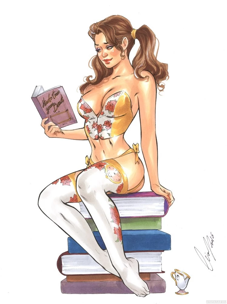 a stack of books, which suggests a theme of reading or literature. In one hand, she holds a book open, as if reading it, while the other hand holds a cup that resembles a teacup, perhaps indicating