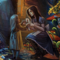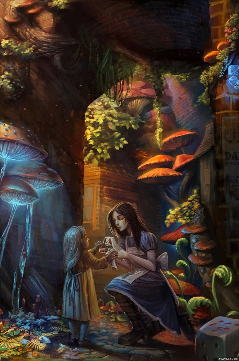 a young girl with a small figurine of an animal in her hand. She appears to be looking up at the person kneeling next to her on the right. This character is wearing a dress that resembles Alice's from "Alice in Wonderland," and she has