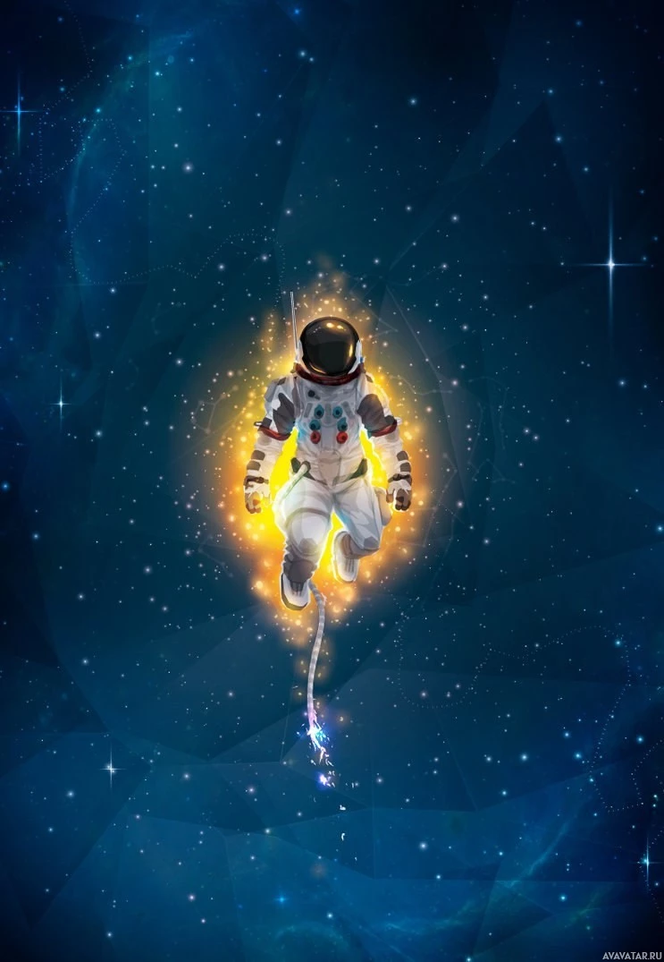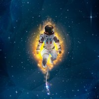 The image shows an astronaut floating in space. The astronaut is depicted with a detailed suit and helmet, suggesting they are on a mission or exploring the cosmos. Surrounding the astronaut is a luminous,