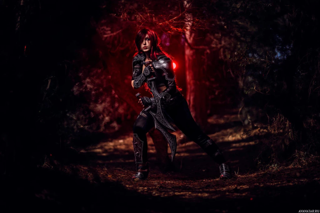 In the image, there is a person dressed in cosplay attire that resembles the character Katarina from "