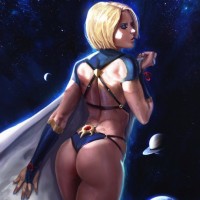 utility belt. Additionally, there are references to space themes in the background, which could suggest she is depicted as a heroine set against