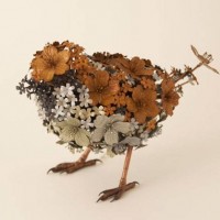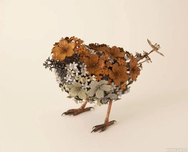 unique sculpture is crafted with various materials such as flowers, seeds, and possibly other natural elements to create an intricate and detailed representation of the bird. The colors of the floral components contrast with each other, adding depth and visual interest to the design. It's