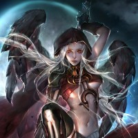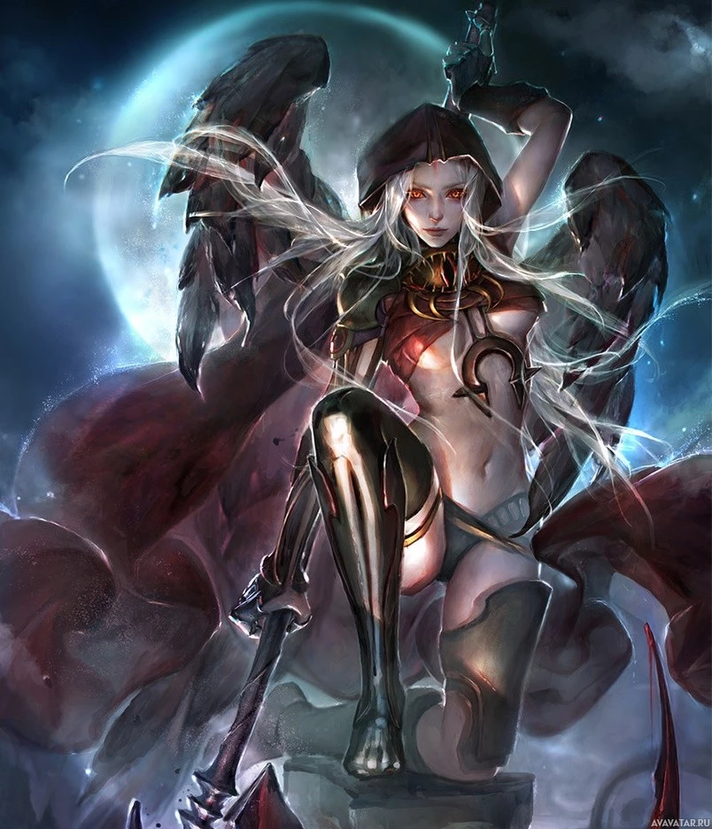 The image features a fantasy-themed character. She has long, flowing silver hair and is wearing what appears to be a dark or black