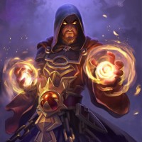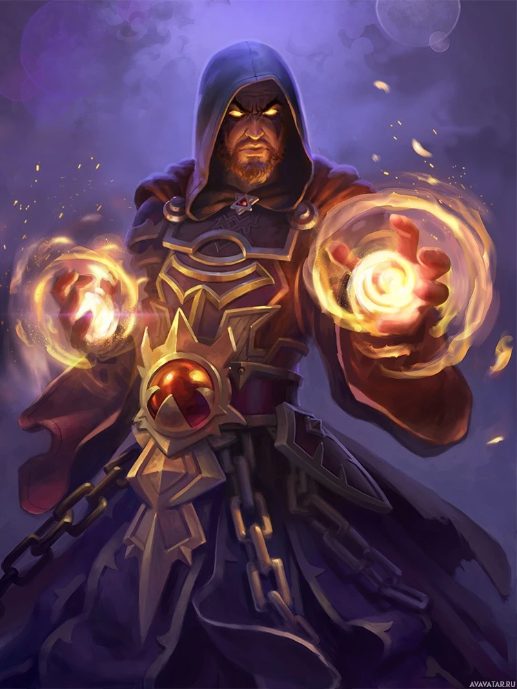 a fantasy character who appears to be a mage or wizard. The character is wearing a hood, and the image has