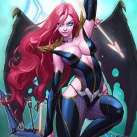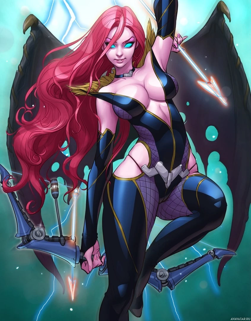 red hair and is wearing a black outfit with blue accents, which could suggest she's a warrior or a character of some sort of fantasy realm. In her hands, she holds what looks like a weapon, possibly a bow and arrow, and she appears to be in