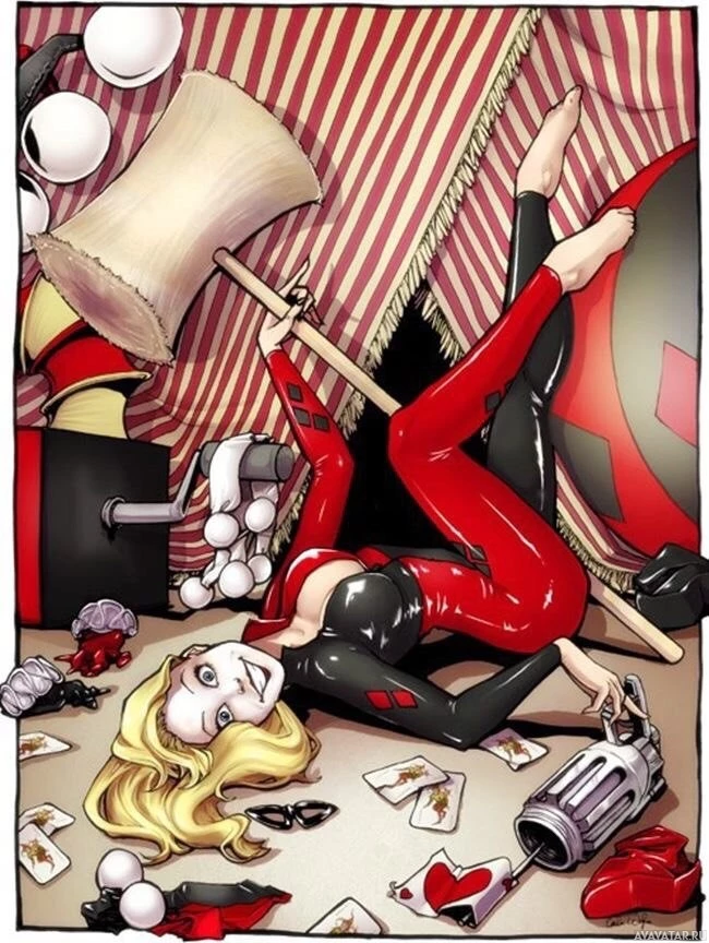 Harley Quinn, a fictional character from the Batman series. She is lying on her back on what appears to be a chaotic floor with various items around her, including