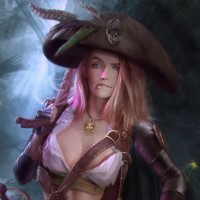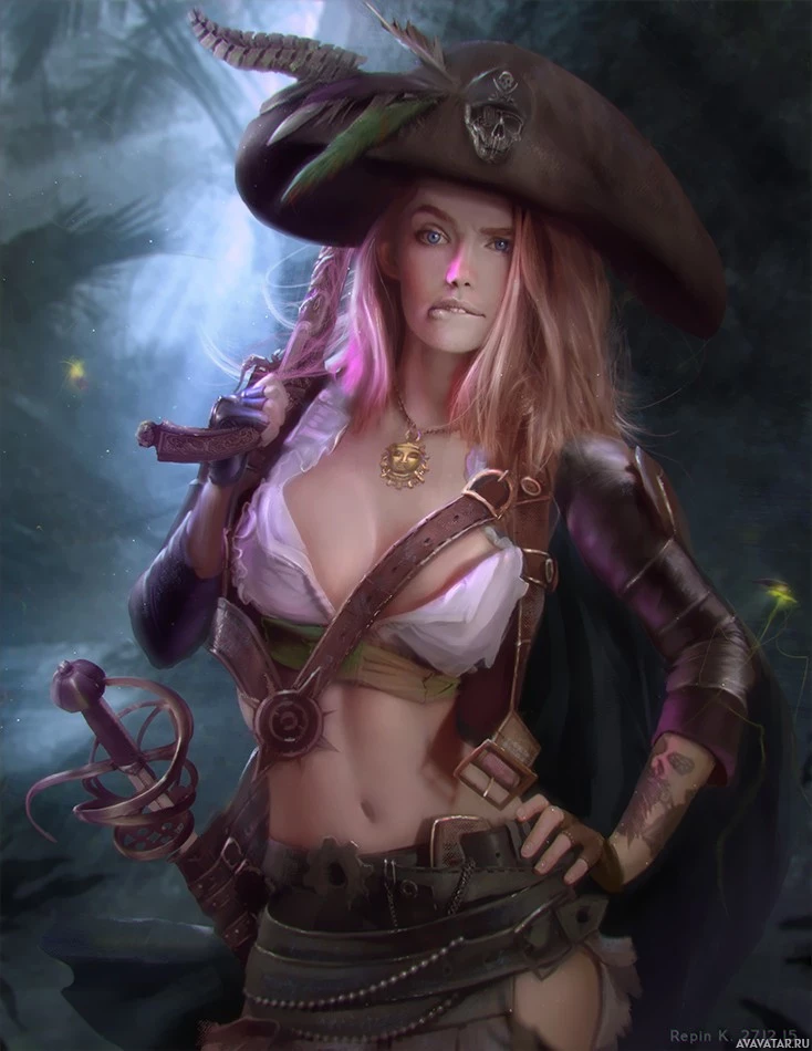 На картинке изображена женщина, одетая в пиратский наряд. У нее светлые волосы, на ней трикорновая шляпа с перьями и шлейфом, а на поясе висит меч. Поза персонажа предполагает, что она уверена в себе и готова к действию.