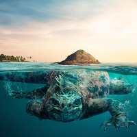 an underwater view of a sea turtle swimming near the surface, with a tropical island in the background. There is also a coral reef visible, which adds to