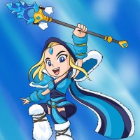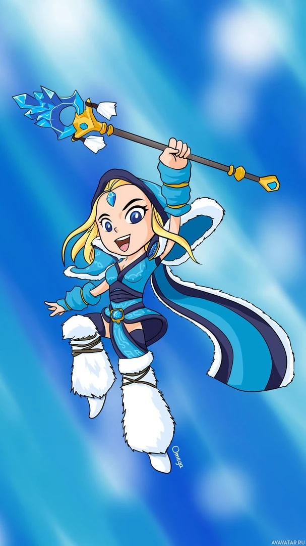 Crystal Maiden. She is depicted in mid-air, holding onto a staff with her right hand and her left arm stretched out behind her. The character is wearing blue and white armor with what appears to be crystals on her shoulder, which aligns with her name as "Crystal Maiden." The background suggests she is set against