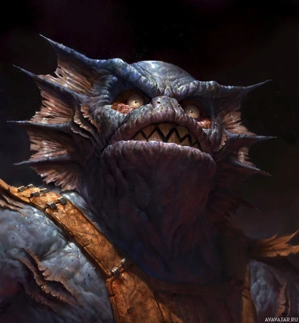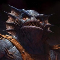 a fantasy creature that appears to be a monster, possibly inspired by mythological or fantastical themes. It has the head of a fish with scales and gills, combined with the body of