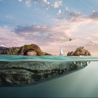 an underwater scene where a large, crocodile-like creature is swimming near the surface. In the background, there are two islands with