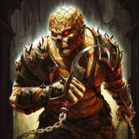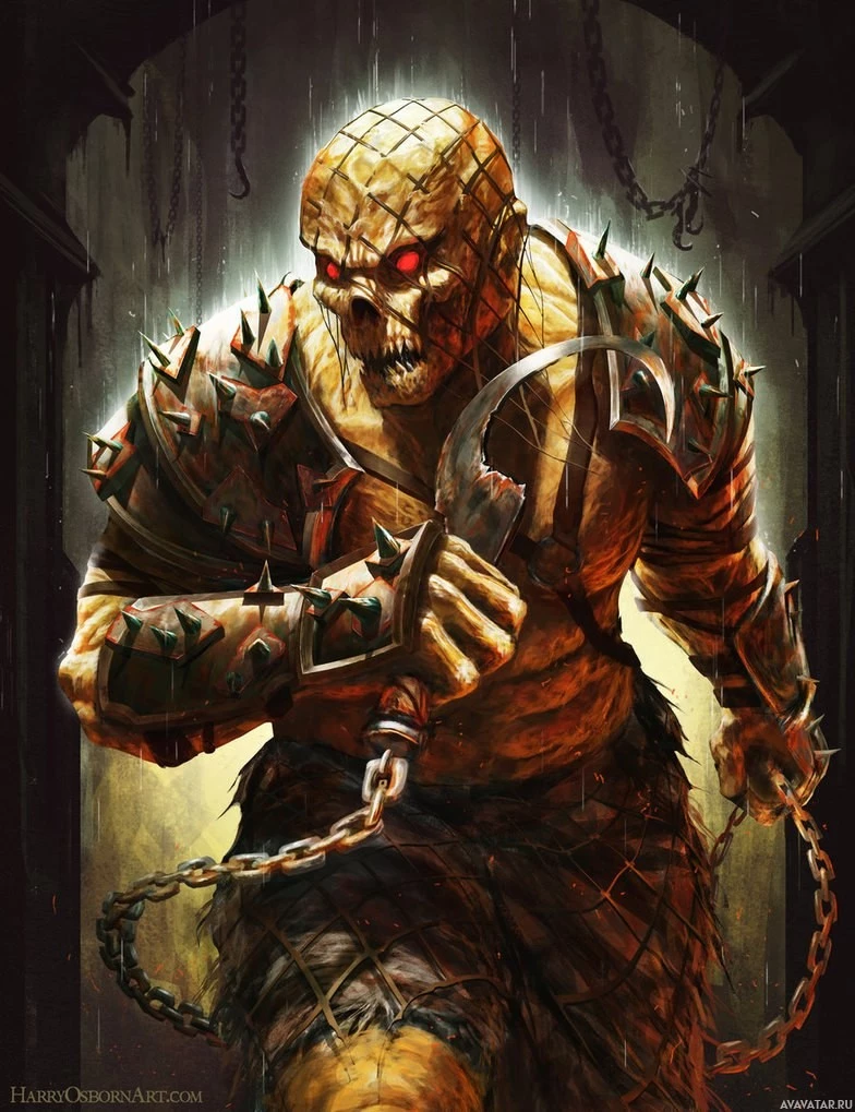 humanoid form and is wearing armor or clothing made of what looks like metal chains and spikes. It has