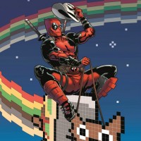 The image depicts the character Deadpool, a popular comic