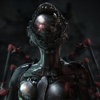 a dark background which contrasts with the metallic sheen of the robot's body, giving it an ominous presence. The image is likely related to