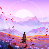 a field of flowers with petals that are falling around, giving the impression of a gentle breeze. The sky transitions from