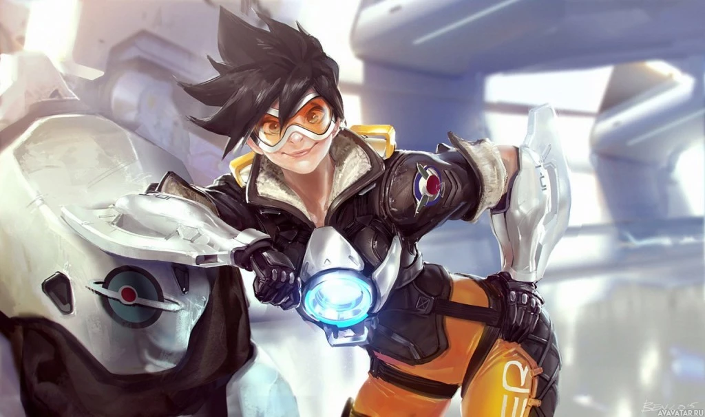 the video game "Overwatch." This character is Tracer, known for her ability to time-jump and blink around the battlefield. She's holding what appears to be a weapon that shoots