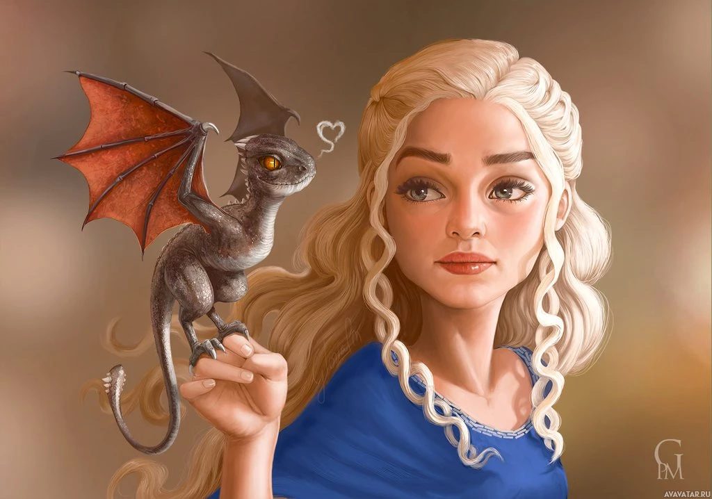 a small dragon in her hand, which appears to be a young dragon due to its smaller size compared to full-grown dragons seen in the show. The character's expression is one of gentle care and affection towards
