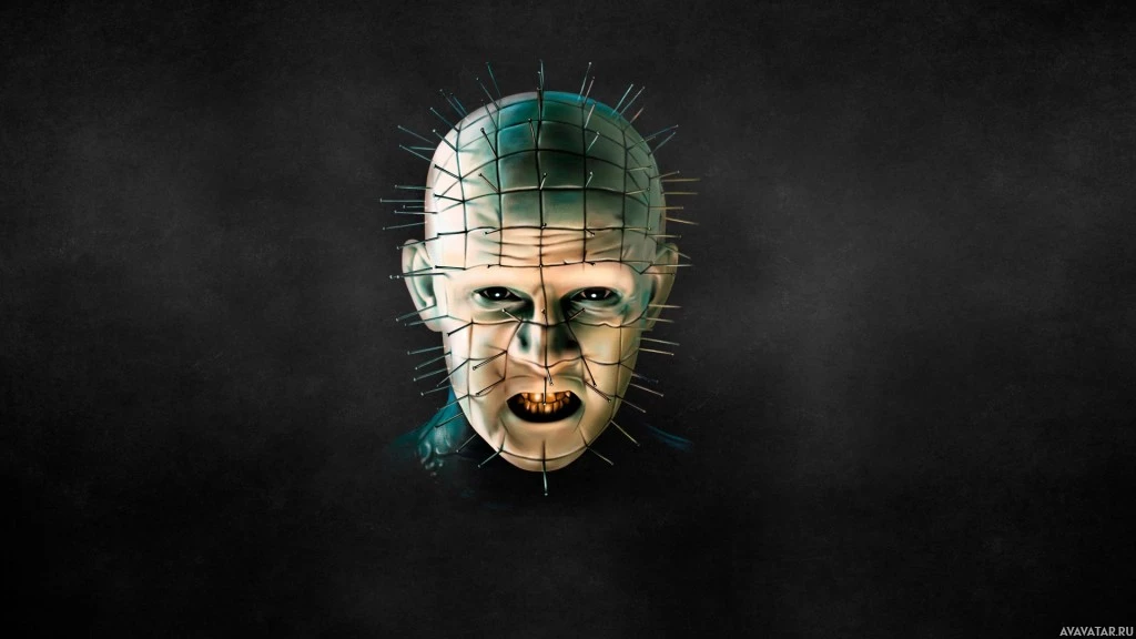 The image depicts a person wearing a mask that resembles the character Pinhead from the horror