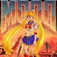 the video game "Doom" with the popular Japanese animated television series, Sailor Moon. In the foreground, there is a character who resembles