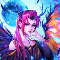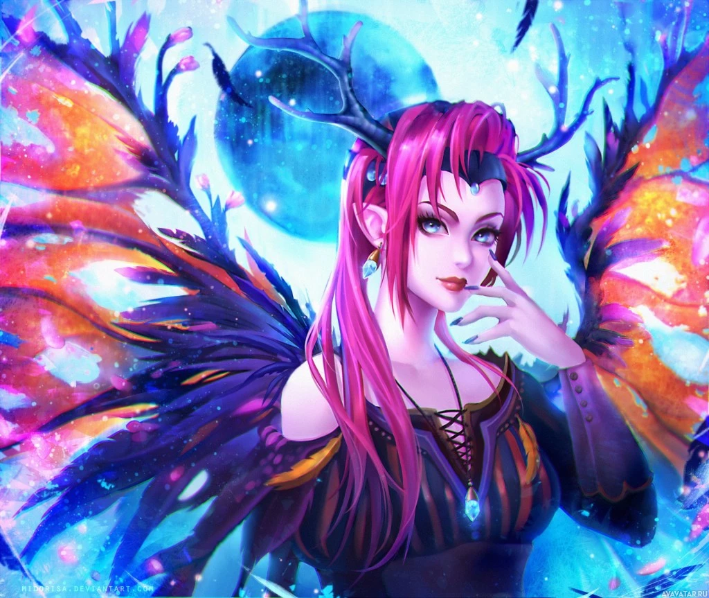 The image depicts a fantasy-themed illustration of a character that appears to be an elf or fairy. The character has wings and is adorned with what looks like feathers or some kind of