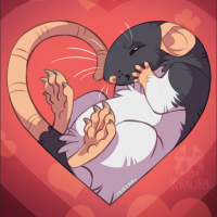 a heart shape drawn around it. The rat appears to be nibbling on its tail and has a somewhat surprised or confused expression, which adds a playful and cute touch to the image. The background is red, which further enhances