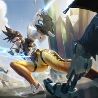 the video game "Overwatch." This is Tracer, known for her ability to manipulate time and her iconic Pulse Rifle. She is depicted in action, possibly using one of her abilities that involves moving quickly through time or space.