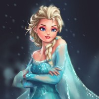 a young woman with blonde hair and blue eyes, wearing her signature ice-blue dress adorned with snowflake patterns and a cape made of icy tendrils that match the color scheme of her dress. The background suggests it might be a snowy evening or night scene, which is fitting for Elsa's character given her powers over ice and snow.