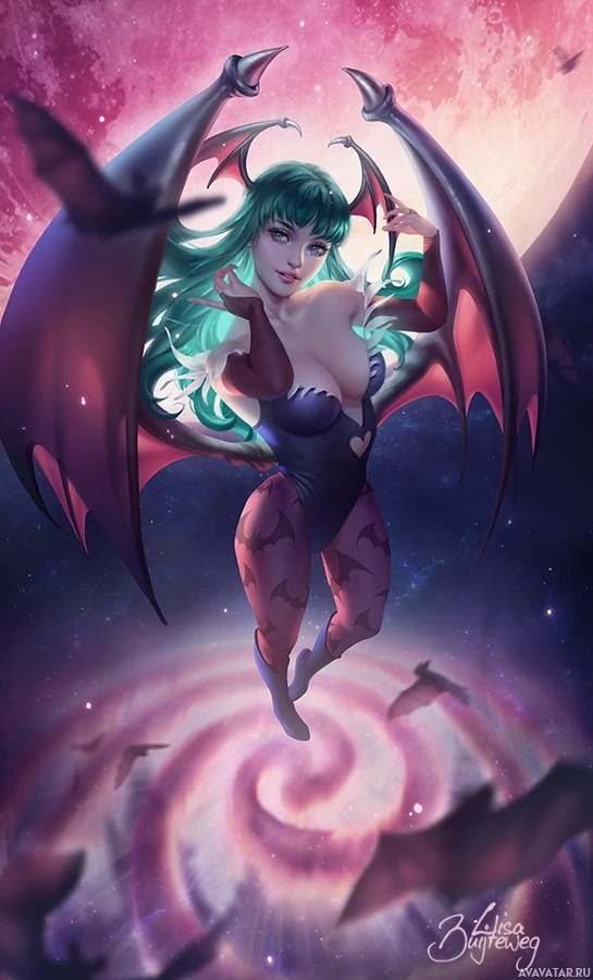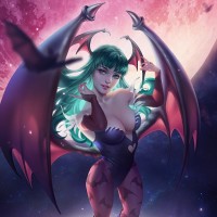 an animated character who appears to be a vampire or demon, given the winged form and bat-like features. The character is shown in