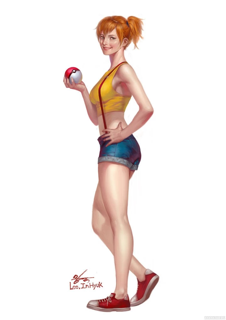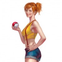 an illustrated character that resembles Misty from the Pokémon series. She is holding a Pokeball, and she appears to be in