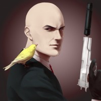 a serious expression on his face and is looking directly at the viewer. On his left shoulder rests a canary, perched calmly despite the situation. The backdrop is dark, which contrasts sharply with the character's attire, suggesting he might be from