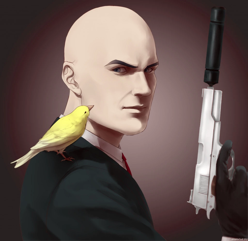 a bald head holding a pistol in his right hand. He has