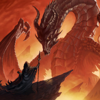 a fantasy scene featuring a dragon and a cloaked figure. From behind, the dragon is shown with its wings spread wide, conveying