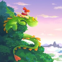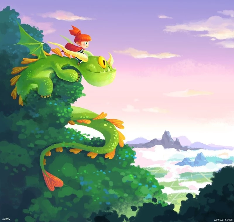 an animated character, a young girl, sitting on the back of a friendly green dragon. They are surrounded by