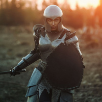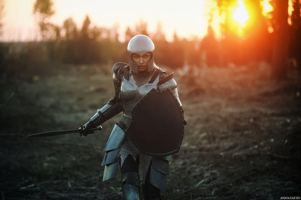 fantasy armor. The armor includes elements like chainmail and possibly greaves. They are holding a sword with both hands, suggesting they might be a warrior. The setting looks like it could be at sunset or sunrise, given