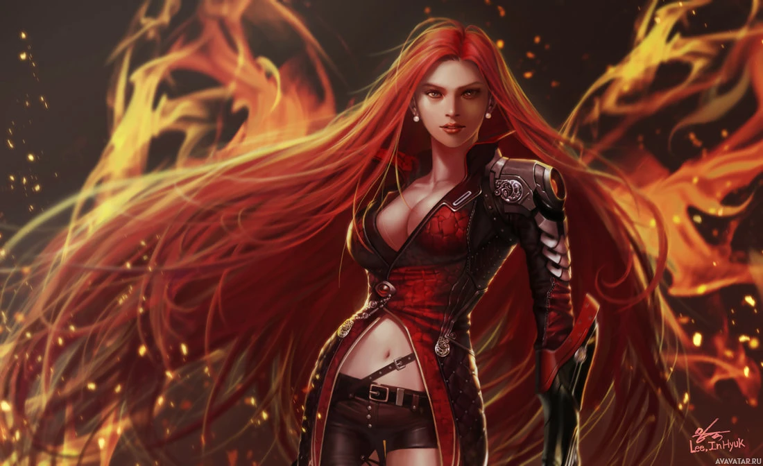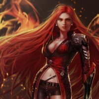 a female figure, possibly a superhero or a character from a fantasy series, based on the attire and fiery background. The character is wearing a costume that combines elements of armor and