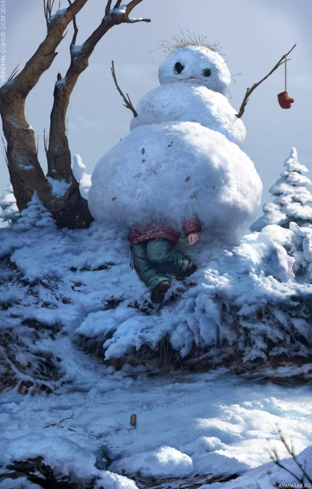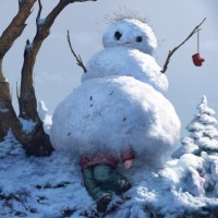 winter scene featuring a snowman and a child. The snowman, which is anthropomorphized with arms and facial features, appears to be sitting on the ground, while a child is peeking out from behind it. Snowflakes are falling around them, creating a festive atmosphere typical of a snowy