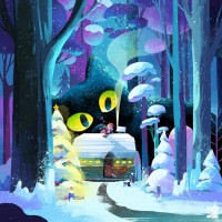 a snowy path leading up to it, with trees covered in snow on both sides. Above the door, an owl is perched, adding to the winter theme. The overall mood of the image is warm and festive, fitting for