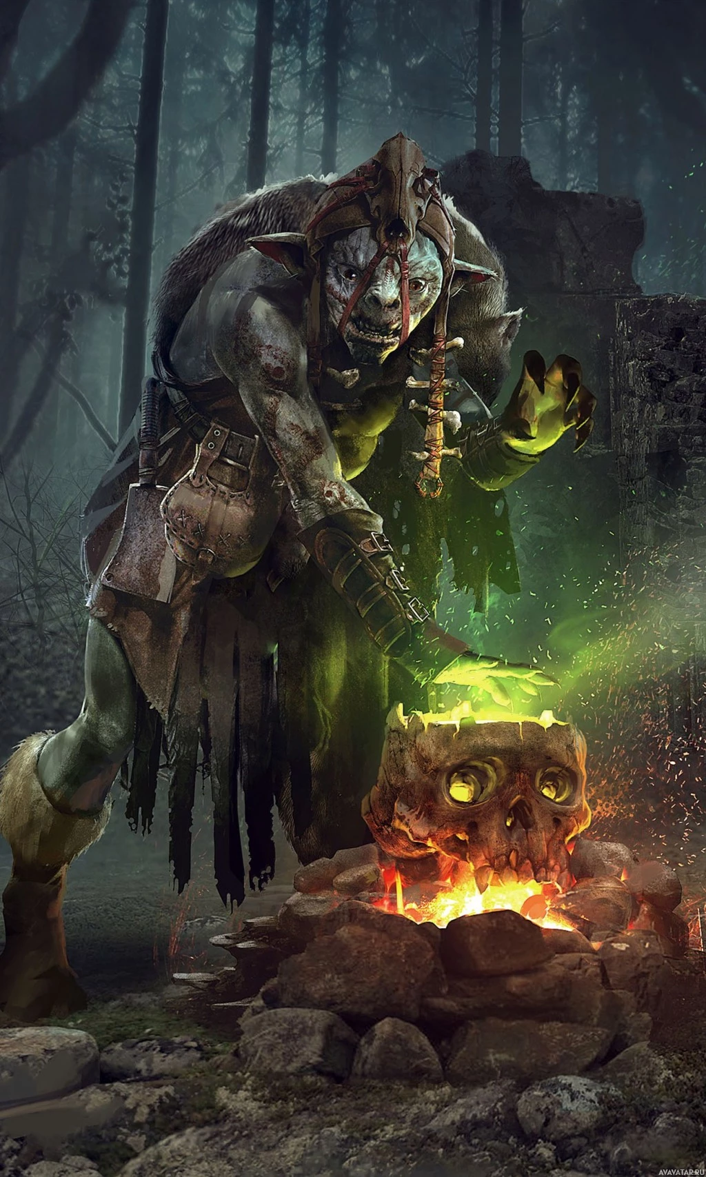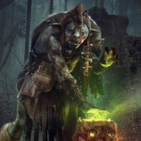 a fantasy setting. The goblin is crouched down, holding what seems to be a staff or wand in one hand and is wearing