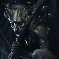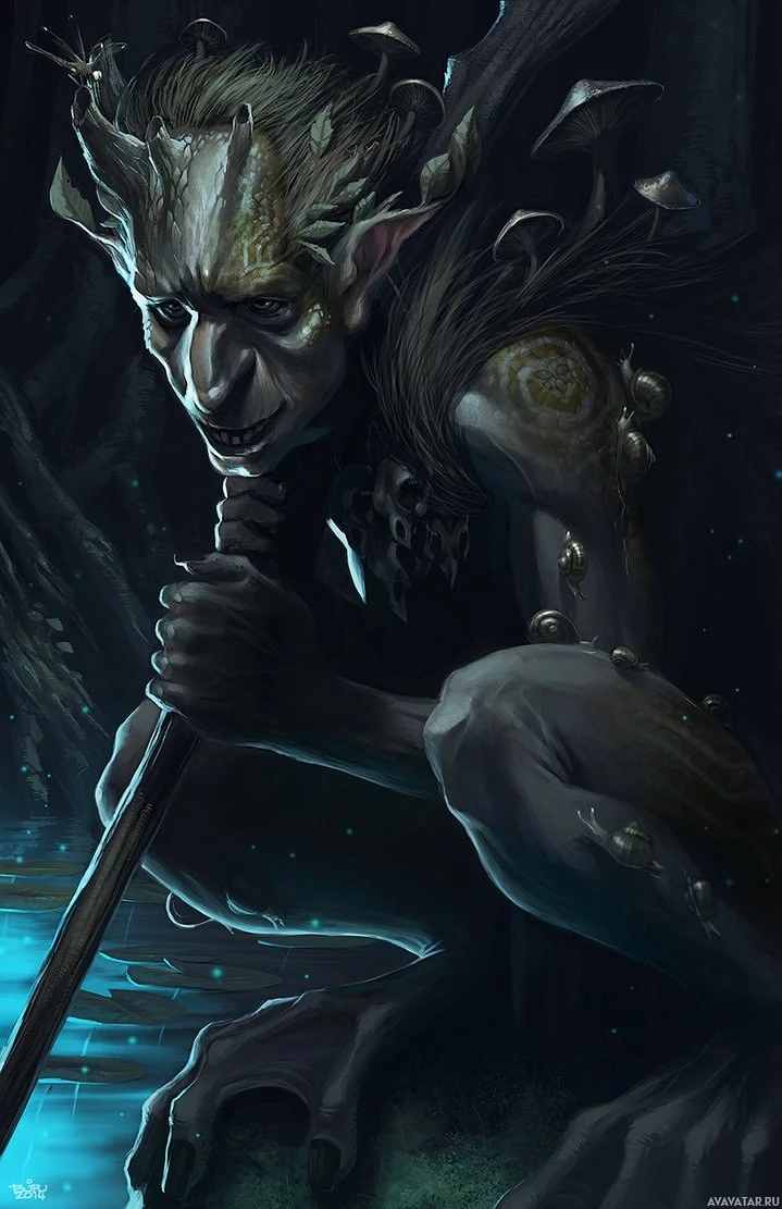 The image depicts a fantasy-themed character, reminiscent of a fairy or gnome from folklore. This character is crouched down on one knee and appears to be holding or using a staff or wand with both hands. The setting looks like a forest or underground cave environment, suggested by the greenery and the natural